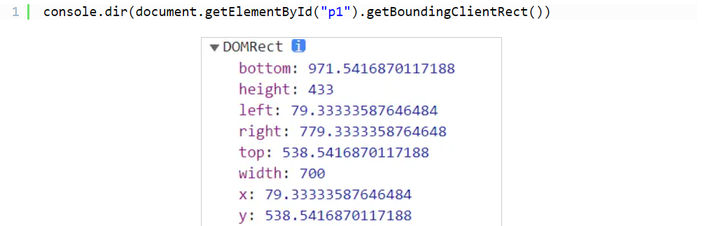 Element.getBoundingClientRect() 方法返回元素的大小及其相对于视口的位置。返回值是一个 DOMRect 对象,这个对象是由该元素的 getClientRects() 方法返回的一组矩形的集合,就是该元素的 CSS 边框大小。返回的结果是包含完整元素的最小矩形,并且拥有left, top, right, bottom, x, y, width, 和 height这几个以像素为单位的只读属性用于描述整个边框。除了width 和 height 以外的属性是相对于视图窗口的左上角来计算的。