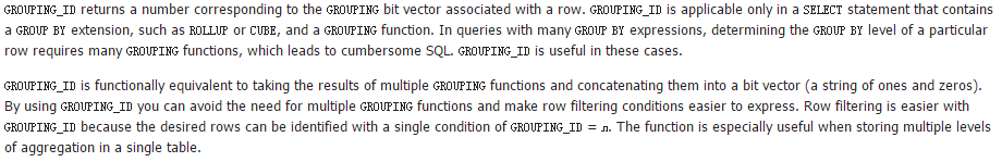 GROUPING_ID在功能上相当于将多个GROUPING函数的结果串接成二进制数,返回的是这个二进制数对应的十进制数。