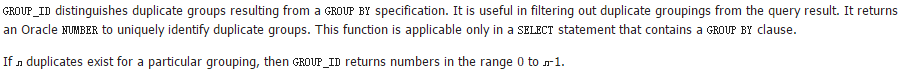 SQL> select group_id(),deptno,sum(sal) from emp group by rollup(deptno,deptno); GROUP_ID() DEPTNO SUM(SAL) ---------- ---------- ---------- 0 10 8750 0 20 10875 0 30 9400 1 10 8750 1 20 10875 1 30 9400 0 29025 7 rows selected.