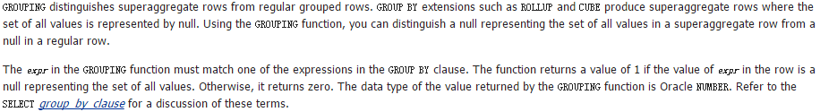 SQL> select grouping(deptno)g_d,grouping(job)g_j,grouping_id(deptno)gi_d,grouping_id(job)gi_j,grouping_id(deptno,job)gi_dj,grouping_id(job,deptno)gi_jd,deptno,job,sum(sal) from emp group by cube(deptno,job); G_D G_J GI_D GI_J GI_DJ GI_JD DEPTNO JOB SUM(SAL) ---------- ---------- ---------- ---------- ---------- ---------- ---------- --------- ---------- 1 1 1 1 3 3 29025 1 0 1 0 2 1 CLERK 4150 1 0 1 0 2 1 ANALYST 6000 1 0 1 0 2 1 MANAGER 8275 1 0 1 0 2 1 SALESMAN 5600 1 0 1 0 2 1 PRESIDENT 5000 0 1 0 1 1 2 10 8750 0 0 0 0 0 0 10 CLERK 1300 0 0 0 0 0 0 10 MANAGER 2450 0 0 0 0 0 0 10 PRESIDENT 5000 0 1 0 1 1 2 20 10875 0 0 0 0 0 0 20 CLERK 1900 0 0 0 0 0 0 20 ANALYST 6000 0 0 0 0 0 0 20 MANAGER 2975 0 1 0 1 1 2 30 9400 0 0 0 0 0 0 30 CLERK 950 0 0 0 0 0 0 30 MANAGER 2850 0 0 0 0 0 0 30 SALESMAN 5600 18 rows selected.
