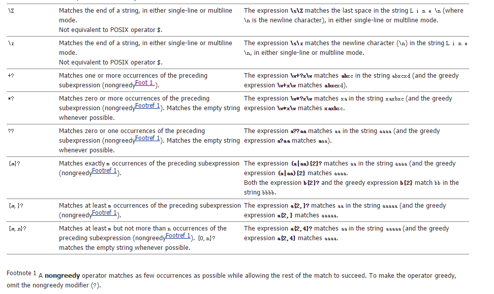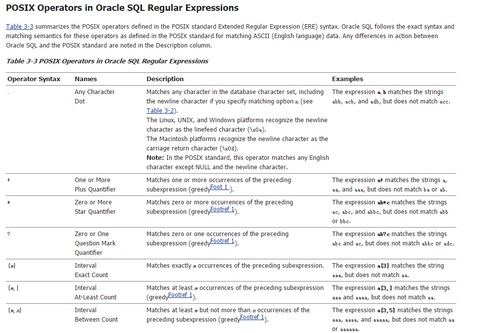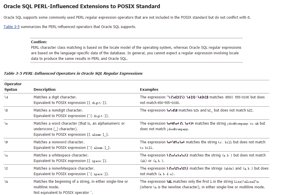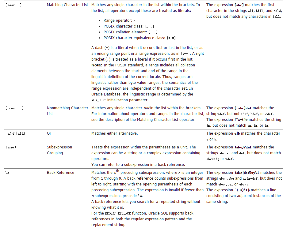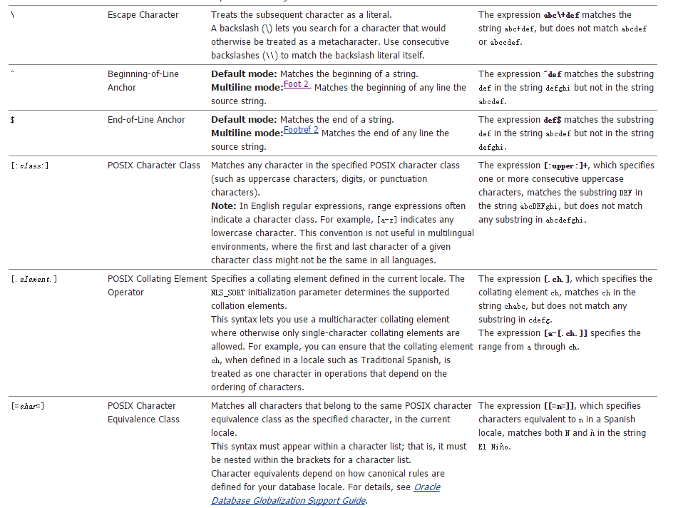 后来查看Oracle官方文档,发现其完全遵循POSIX standard Extended Regular Expression (ERE)语法,同时也引入了perl中自定义的正则操作符,正好前段时间学习Perl,见识了其正则表达式的强大,于是就有了整理的想法。现看到Oracle官方文档整理得如此清晰完备,就直接引用好了。