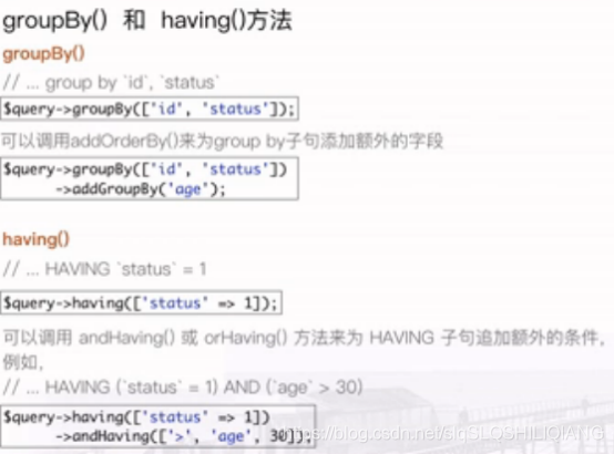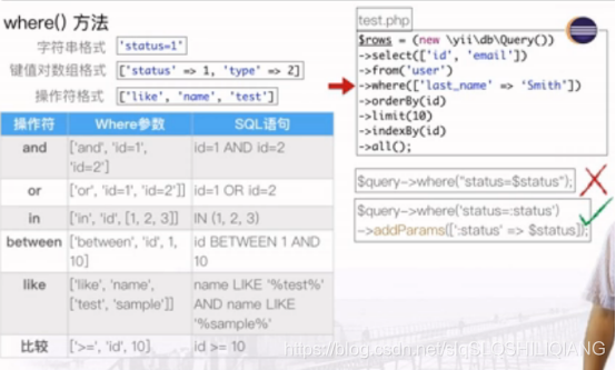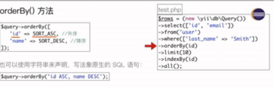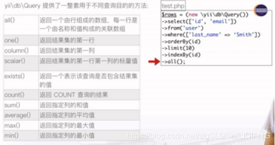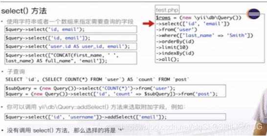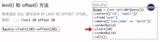 $rows=(new\yii\db\Query())->select([‘’id,’email’])->from(‘user’)->where([‘last_name’=>’Smith’])->orderBy(id)->limit(10){构建查询}