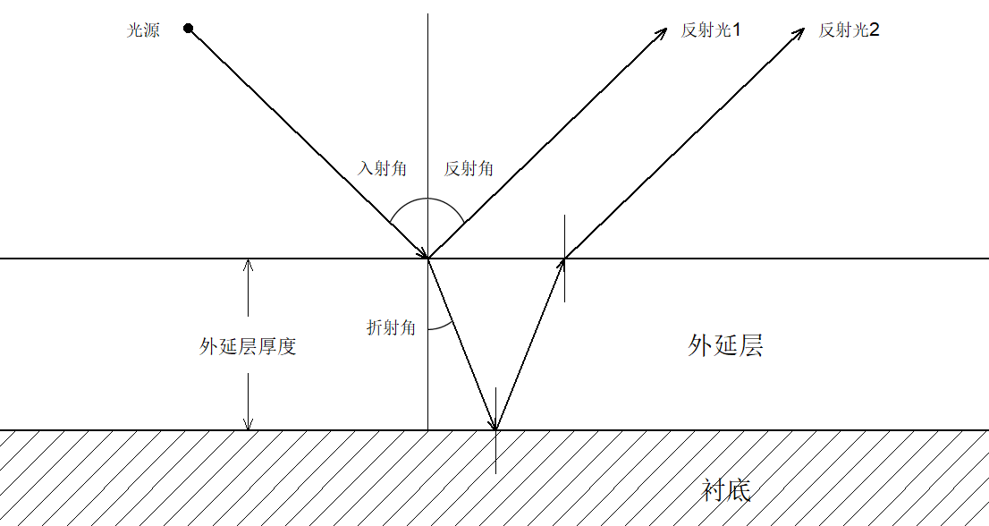 红外干涉法是外延层厚度测量的无损伤测量方法,其工作原理是,外延层与衬底因掺杂 载流子浓度的不同而有不同的折射率,红外光入射到外延层后,一部分从外延层表面反射出 来,另一部分从衬底表面反射回来(图 1),这两束光在一定条件下会产生干涉条纹。可根据 红外光谱的波长、外延层的折射率和红外光的入射角等参数确定外延层的厚度。