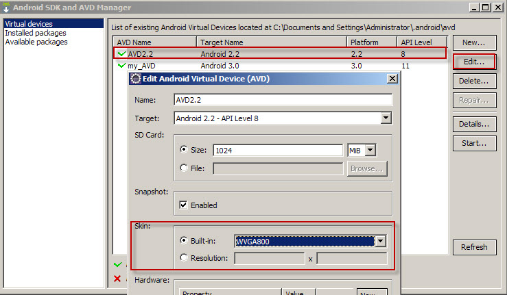 1)一般在创建模拟器的时候,大小和容量就可以设定 在创建模拟器界面的Skin->Built-in 列表中进行选择就可以了。