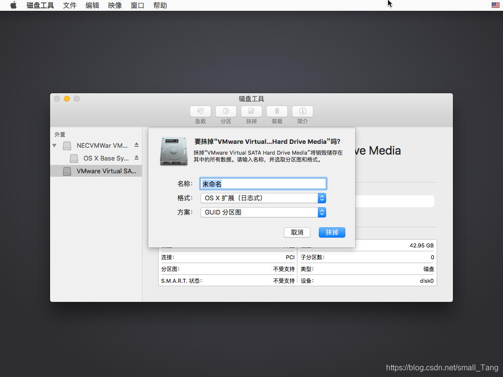 再次打开虚拟机软件,开启此虚拟机,选择实用工具,磁盘工具,抹掉。