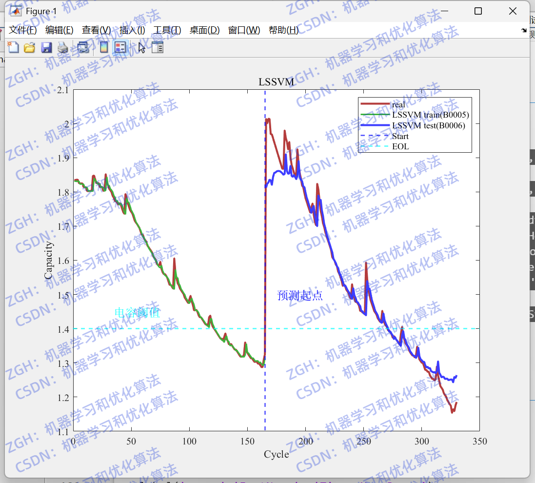 基于最小二乘向量机(LSSVM)的锂电池剩余寿命预测 [电池容量提取+锂电池寿命预测] Matlab代码(单变量)
