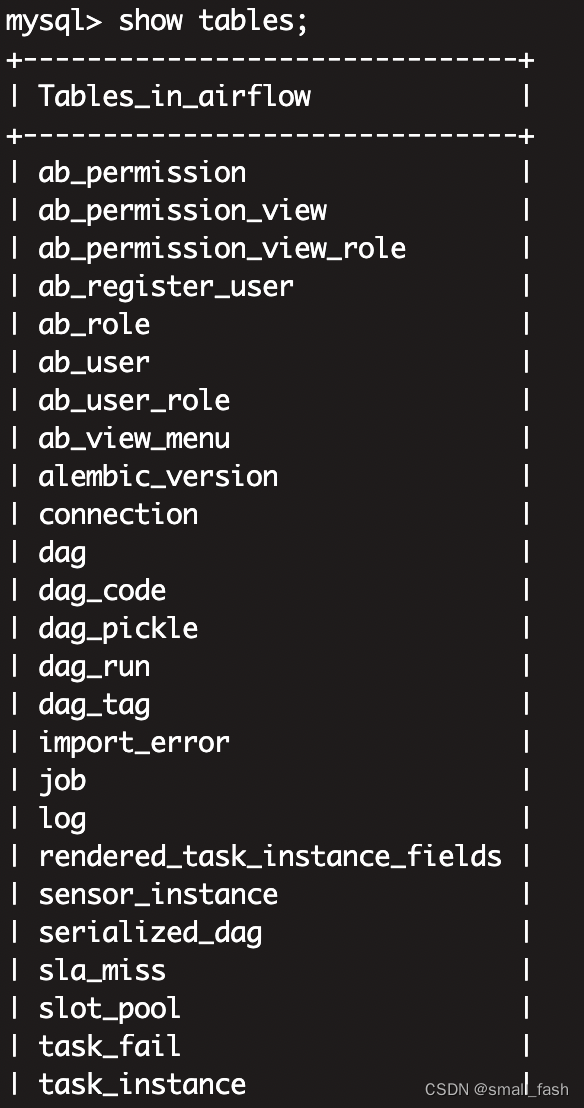 到这里你的mysql也替换完成了,你可以使用新创建的用户 查看表,会发现airflow自动创建了很多表。