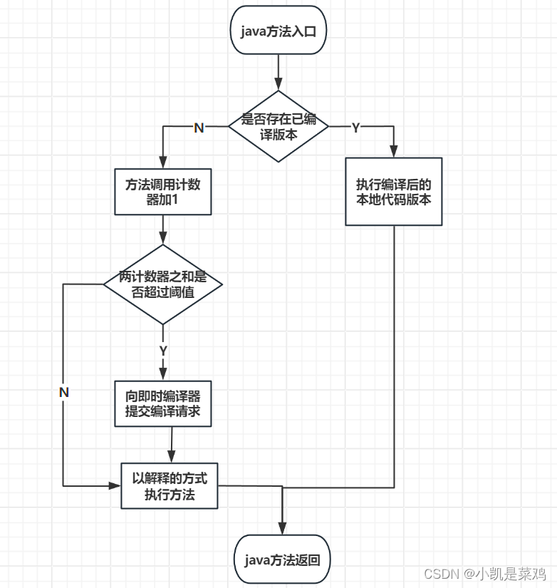 当一个方法被调用时 , 虚拟机会先检查该方法是否存在已被编译过的版本 , 如果存在,则优先使用编译后的本地代码来执行 , 如果不存在被编译过的代码 , 则将该方法调用计数器加1,然后判断是否超过阈值,超过阈值则向即时编译器提交一个该方法的代码编译请求