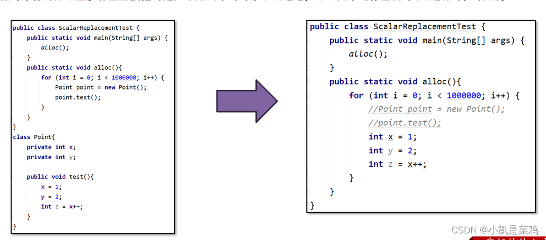逃逸分析真正对性能优化比较大的方式是标量替换,在Java虚拟机中,对象中的基本数据类型称为标量,引用的其他对象称为聚合量。标量替换指的是如果方法中的对象不会逃逸,那么其中的标量就可以直接在栈上分配,省去了创建对象的步骤。
