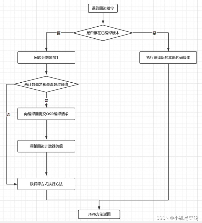 当解释器遇到一条回边指令时,会先查找将要执行的代码片段是否有已经编译好的版本,如果有的话,它将会优先执行已编译的代码,否则就把回边计数器的值加一,然后判断方法调用计数器与回边计数器值之和是否超过回边计数器的阈值。当超过阈值的时候,将会提交一个栈上替换编译请求,并且把回边计数器的值稍微降低一些,以便继续在解释器中执行循环,等待编译器输出编译结果,整个执行过程如图所示。