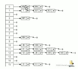 哈希表把数组按键值存放,如下不同位置存放了一个链表