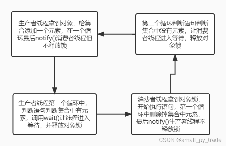 Notations: wait()方法会让当前对象进入等待状态,并释放对象锁。notify()方法只是通知,不进行释放。wait()方法都要在synchronlized的代码块里面调用。