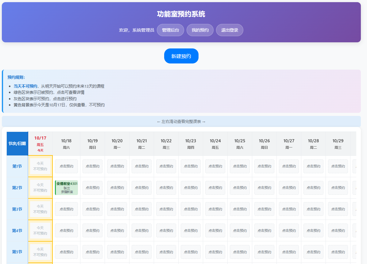 这个系统提供了完整的预约功能,界面简洁易用,特别适合教师在手机端操作。管理员可以方便地管理教师、功能室和预约情况。