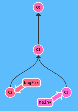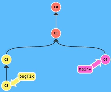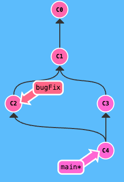 - 如下图main分支和bugFix分支的共同祖先C1,在main分支下执行 git merge bugFix 后,将bugFix的提交节点C2和和main的提交节点C3进行比较合并,在main分支下提交了一个新的合并节点C4,bugFix分支保持不变