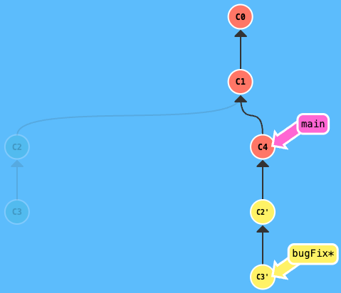 - 如下图,main分支和bugFix分支的共同祖先C1,在bugFix分支执行git rebase main后,将bugFix分支下从共同祖先C1开始的所有提交C2和C3全部“复制”到目标分支main的最新提交C4之后,man分支保持不变,bugFix变基到mian分支之后