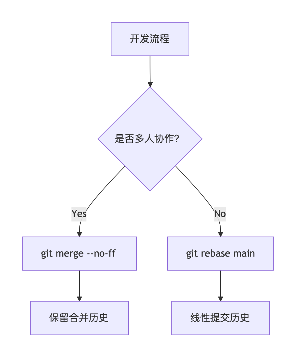 | 个人本地分支同步主分支 | git rebase main | 保持提交历史线性,避免无意义合并节点 |
