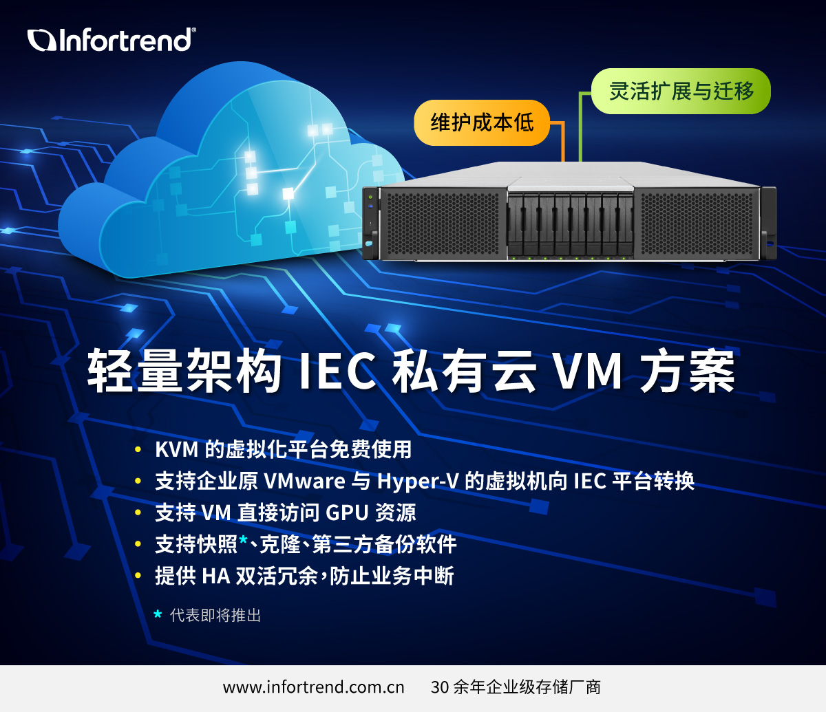 虚拟化市场面临转型,主流厂商(如 VMware)改用订阅制,逐年调高授权与维护成本。长期授权与订阅费用不断上升,加重企业IT预算负担。Infortrend IEC方案基于标准KVM的虚拟化平台,免除高额授权与订阅成本,大幅降低长期 TCO。不仅支持KVM,还能兼容 VMware 与 Hyper-V 的虚拟机格式,协助企业逐步完成平台转换与整合。