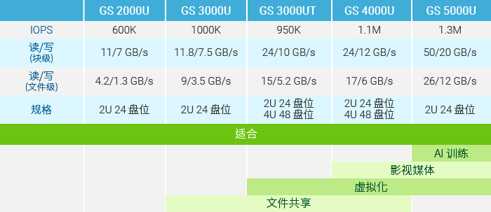 不同的应用程序对性能的要求是不一样的。工作负载强度高,就需要合适的存储,不然会给业务运行带来挑战。下面是GS U.2 NVMe 混合全闪阵列统一存储的应用指南,通过它您能够掌握GS U.2不同的机型,分别对应哪种应用场景。为您的存储需求找到最优选项。