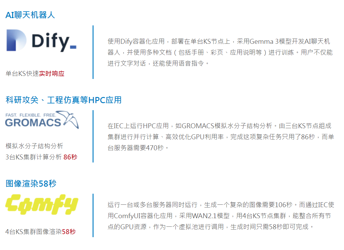IEC在为人工智能项目搭建基础架构方面发挥着关键作用,它涵盖AI项目所需的IaaS、PaaS基础架构。能够运行各类AI应用,无论是制造业中对生产流程的智能监测,还是AI/机器学习领域的算法训练,或是大数据的分析、开发运维 (DevOps)、电商AI客服运营,IEC都能充分满足企业的多样化需求,为企业的智能化转型提供坚实的基础。