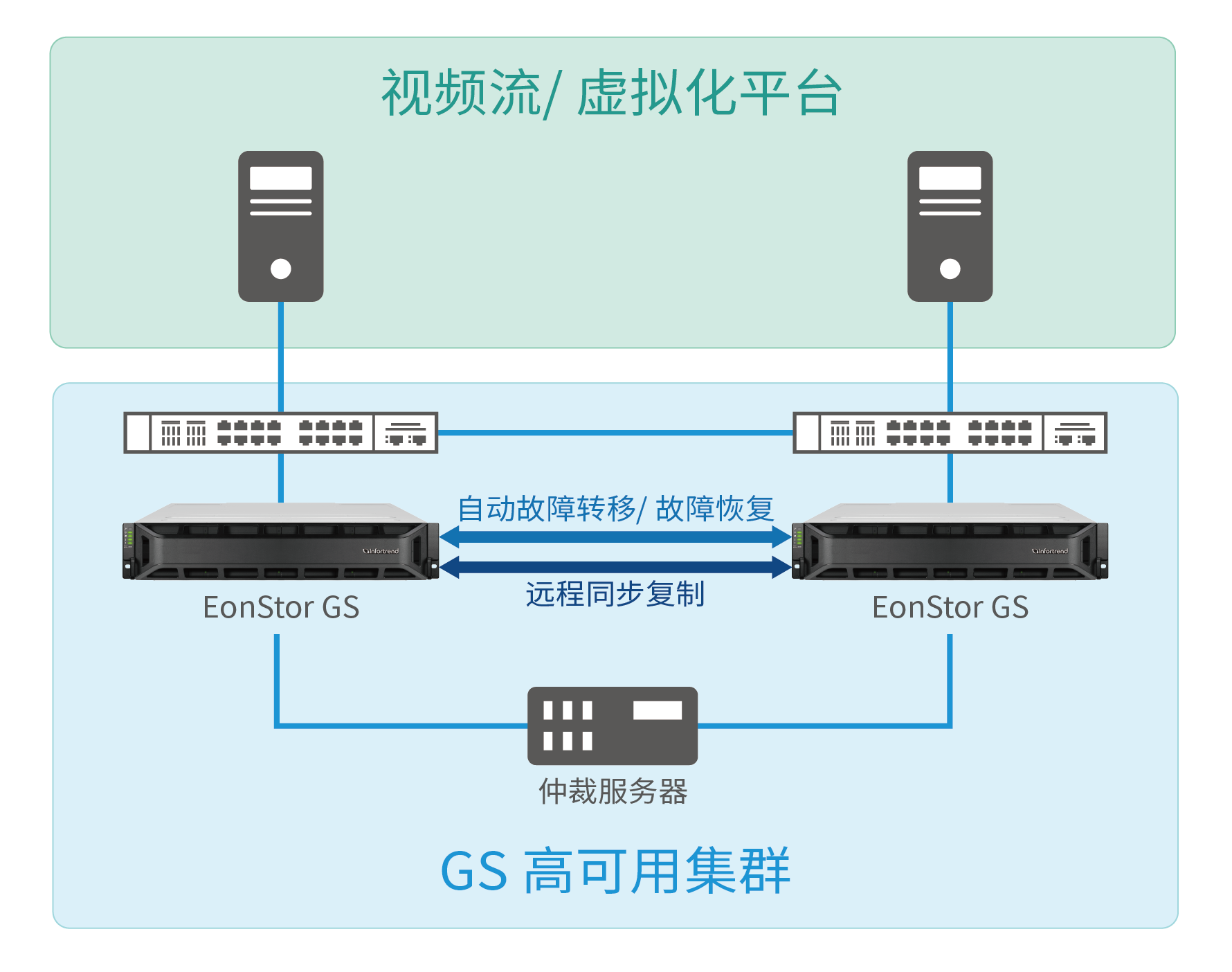 为满足这些要求,公司部署了两套Infortrend EonStor GS 3024UT设备,采用跨站点高可用(HA)存储架构。