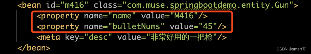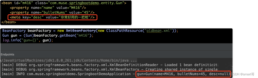 meta标签后,配置的desc并不会体现在Gun的属性当中,而只是一个额外的声明。当需要使用里面的信息的时候,可以通过BeanDefinition的getAttribute(key)方法进行获取。