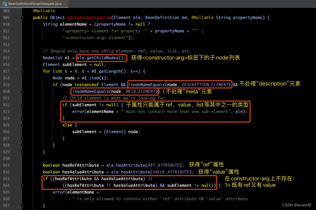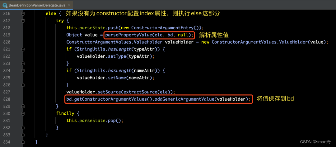 我们可以在上面看到,方法内部又调用了parseConstructorArgElement((Element) node, bd)方法,这里面才是真正解析逻辑的地方: