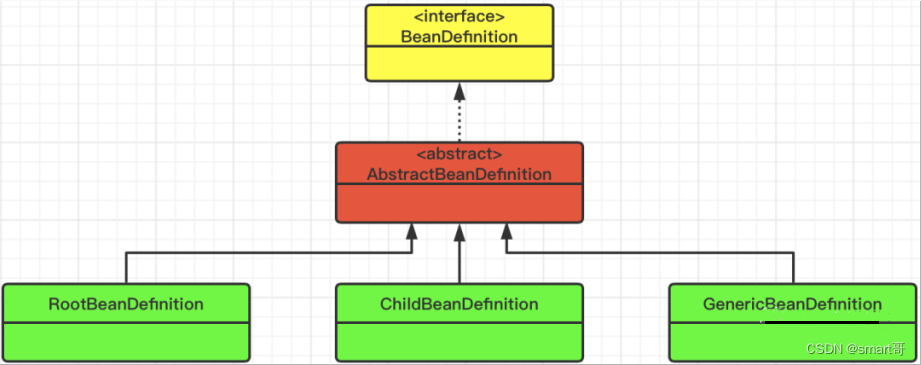 BeanDefinition是配置文件中 <bean>元素标签在Spring容器中的表现形式 ,也就是说,它是用来承载bean信息的。在配置文件中可以定义父级<bean> 和 子集<bean> ,它们分别由RootBeanDefinition和ChildBeanDefinition表示。而如果没有父级的话,则用RootBeanDefinition表示。而GenericBeanDefinition是从2.5版本之后加入进来的,用于为bean文件配置属性属性定义提供一站式服务。这三个类之间的关系如下图所示: