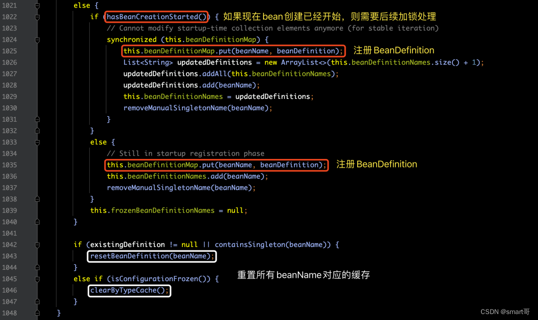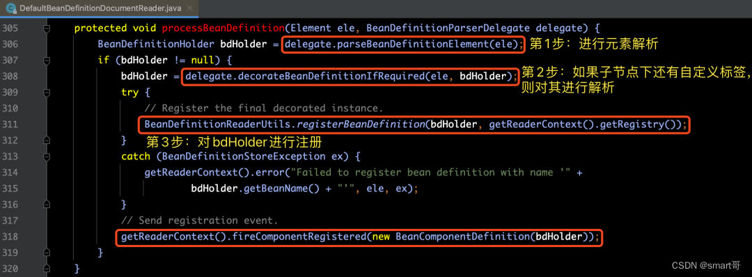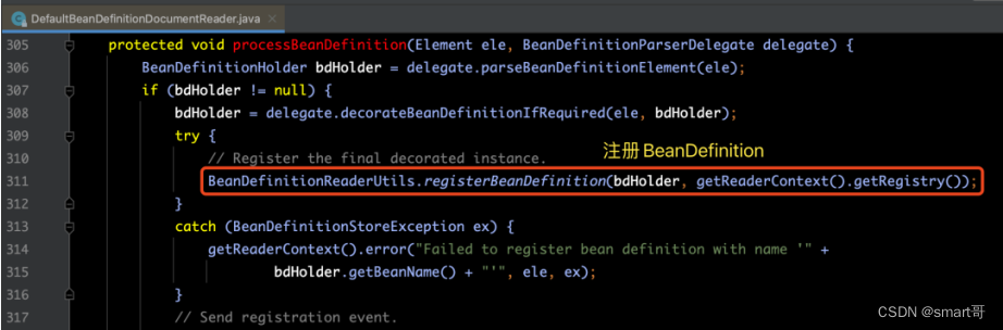 【解释】从上面的代码中,我们可以看到针对bean的注册处理方式上,主要进行了以下几个步骤: