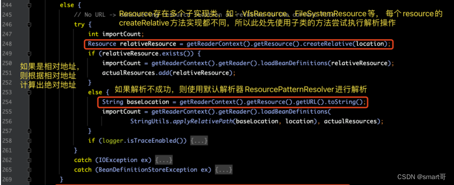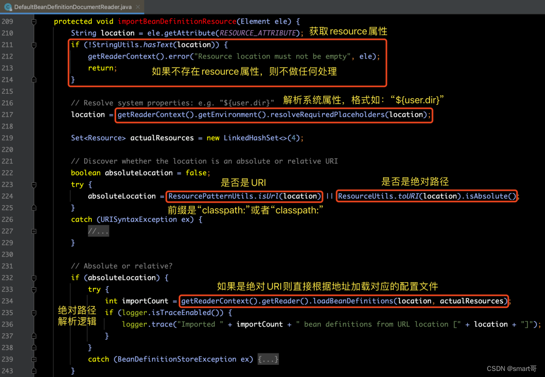 其中,importBeanDefinitionResource(ele)方法的详细源码内容和注释,如下图所示: