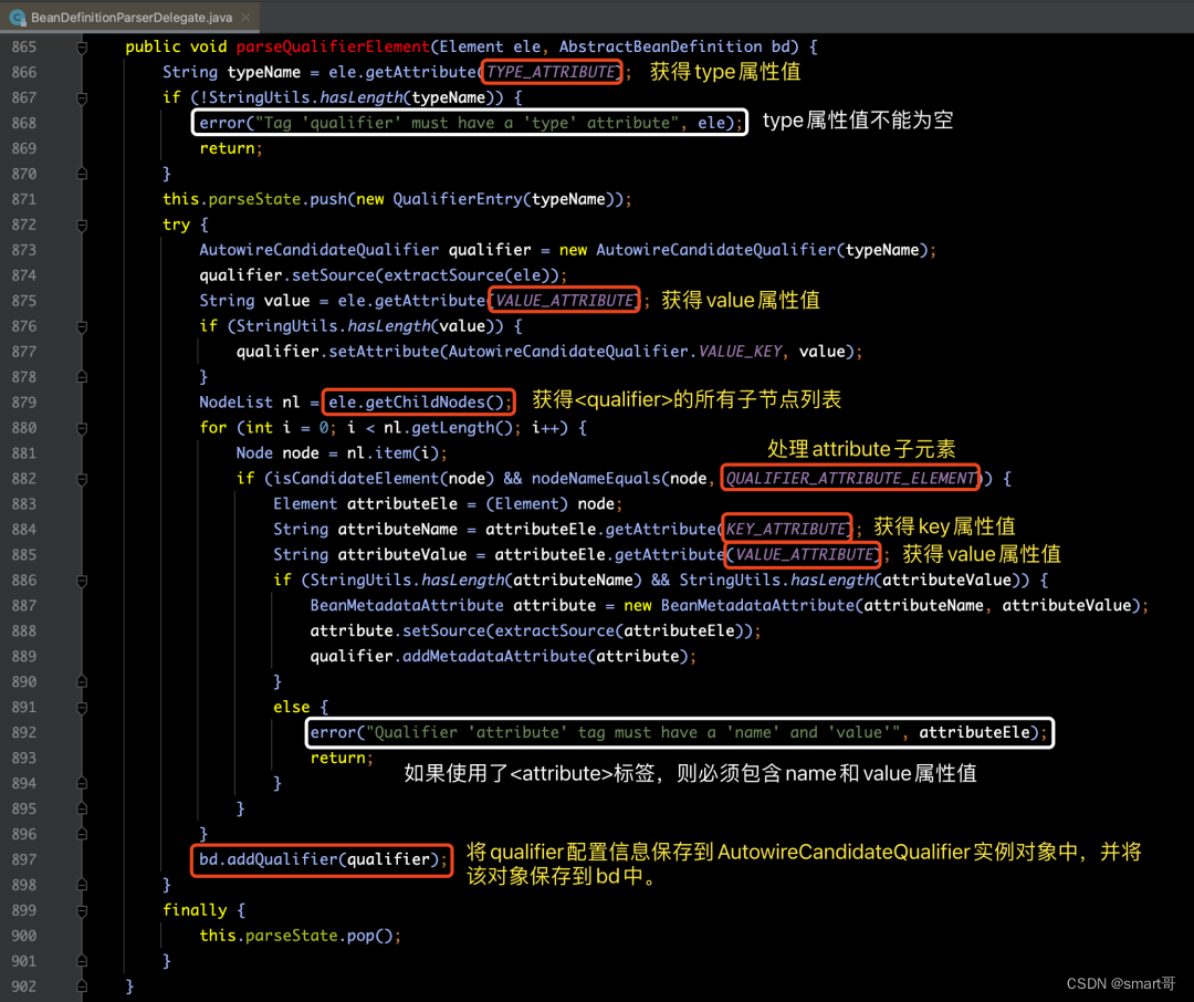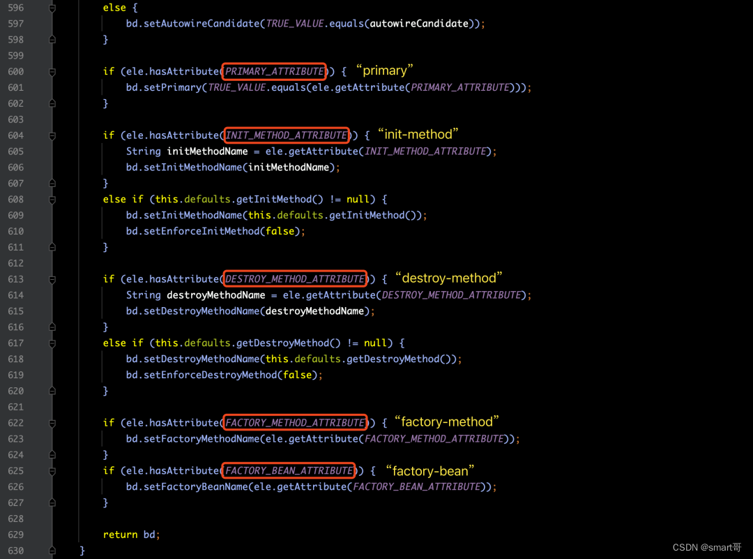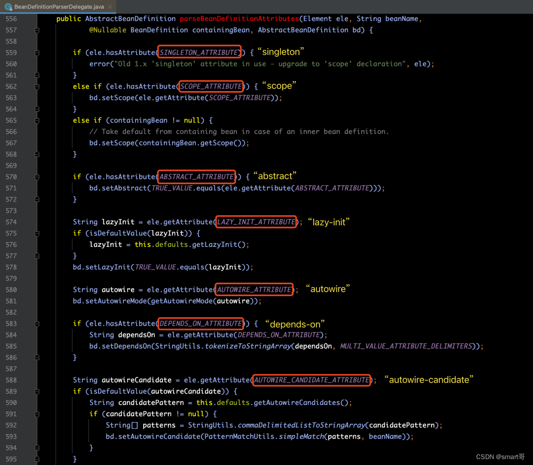 针对parseBeanDefinitionAttributes(ele, beanName, containingBean, bd)方法的源码,如下图所示: