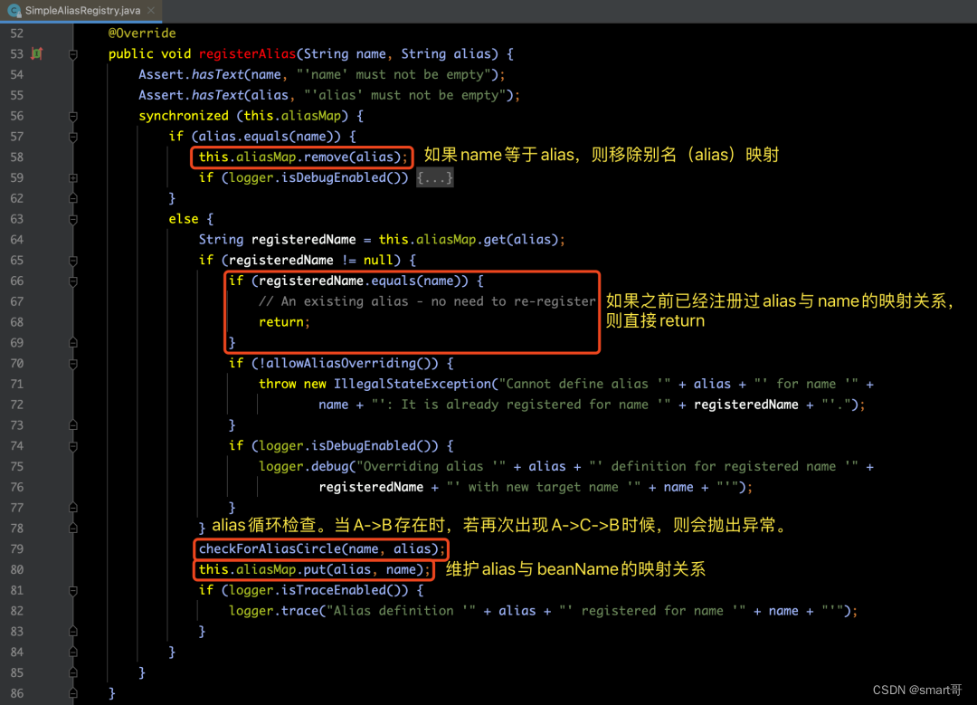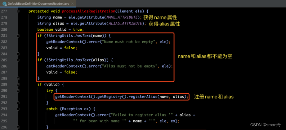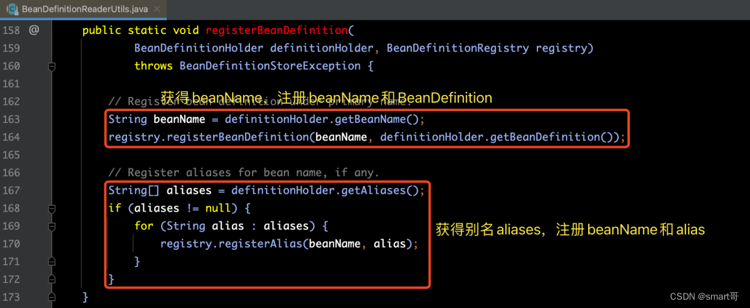 在下面的代码中,我们可以看到总共有两个步骤的操作,分别是:注册BeanDefinition 和 注册别名Alias。