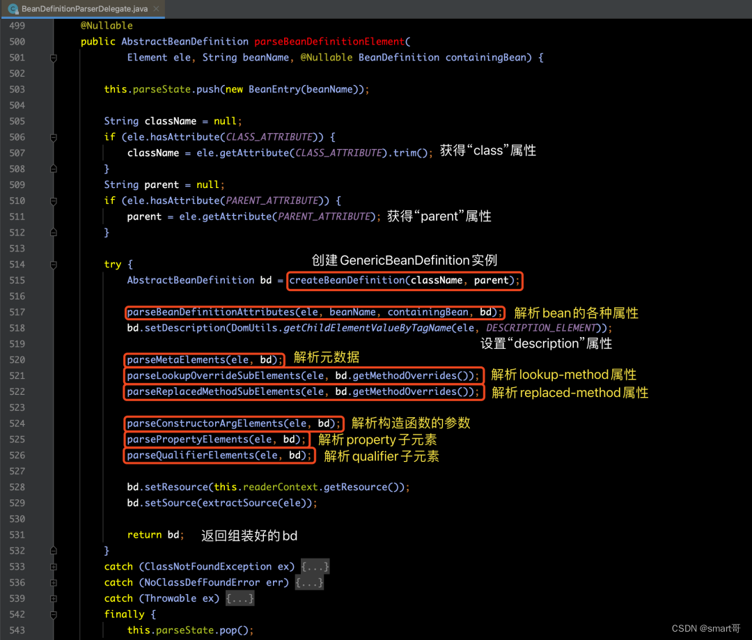在 parseBeanDefinitionElement(Element ele, @Nullable BeanDefinition containingBean) 方法中,其实一共执行了如下4个步骤(【注】但是下图中只列出了其中的第1步骤和第2步骤,后面文章内容,再给大家展示剩下的后两个步骤)。