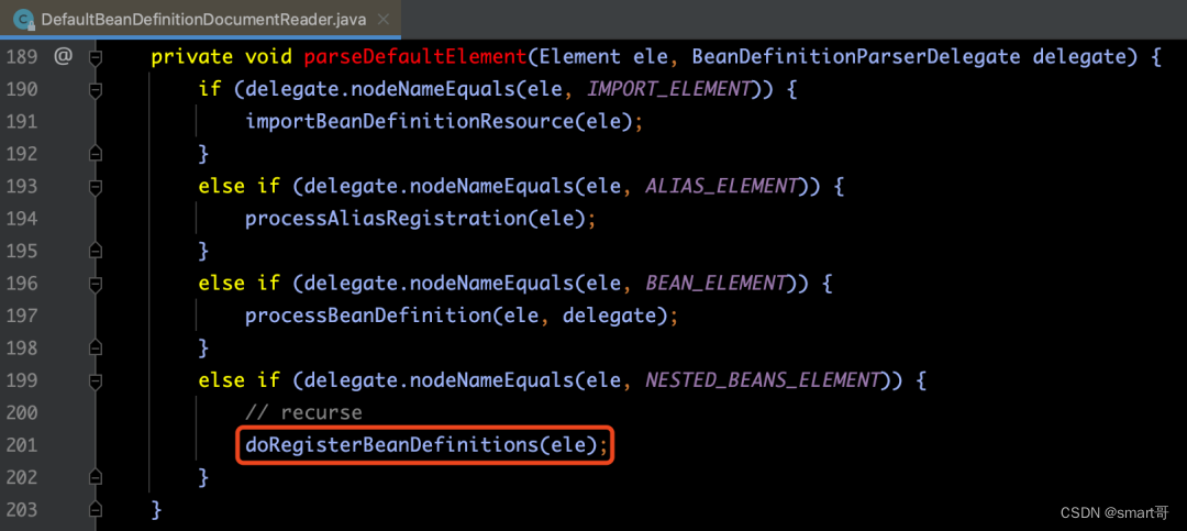 对于嵌入式beans标签来讲,并没有太多可讲,与单独的配置文件并没有太大的差别,无非是递归调用beans的解析过程。并且,在第1讲的2.3.2章节,就对doRegisterBeanDefinitions(ele)方法进行了解析,此处就不在赘述了。