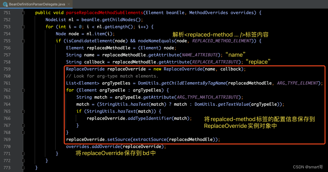 好了,理解了replaced-mothod标签的使用方式之后,我们来看一下parseReplacedMethodSubElements(ele, bd.getMethodOverrides())方法是如何对replaced-method属性进行解析的。详细解题源码如下所示: