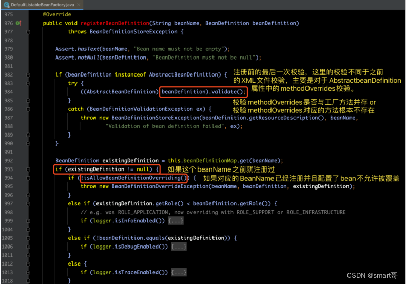 【步骤1】对AbstractBeanDefinition的校验。在解析XML文件的时候我们提过校验,但是此校验非彼校验,之前的校验是针对XML格式的校验,而此时的校验是针对于AbstractBeanDefinition的methodOverrides属性的。