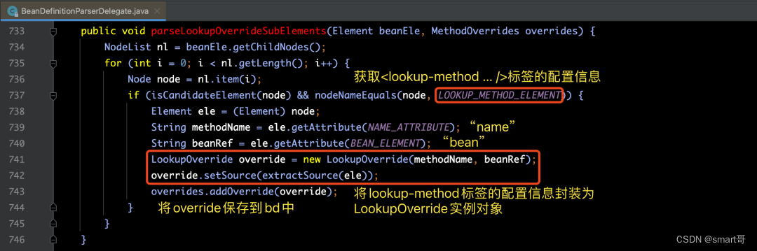 好了,讲完了lookup-method的使用方法和作用之后,我们再来看一下parseLookupOverrideSubElements(ele, bd.getMethodOverrides())方法的源码实现: