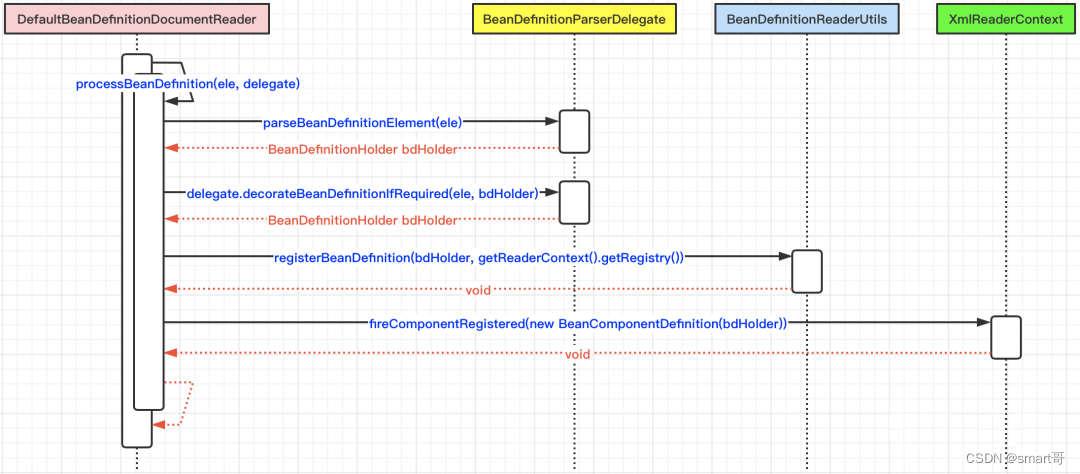 在上面的4种标签中,对bean标签的解析最为复杂和重要,所以我们先从这个标签开始深入分析,如果能够理解它的解析过程,那么其他标签就不难理解了。我们废话不多说,言归正传。先来看看processBeanDefinition(ele, delegate)方法内部的具体实现逻辑: