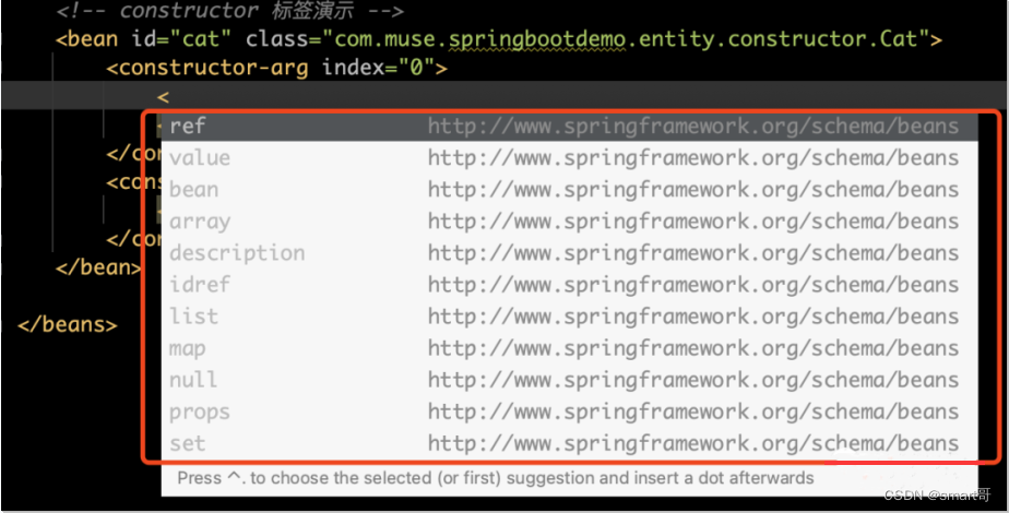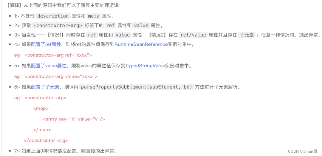 通过上图中源码的注释,可以看出逐一的对constructor-arg的子元素进行解析,针对每个子元素的解析此处不再进行讲解。这些子元素都可以通过如下配置方式进行配置: