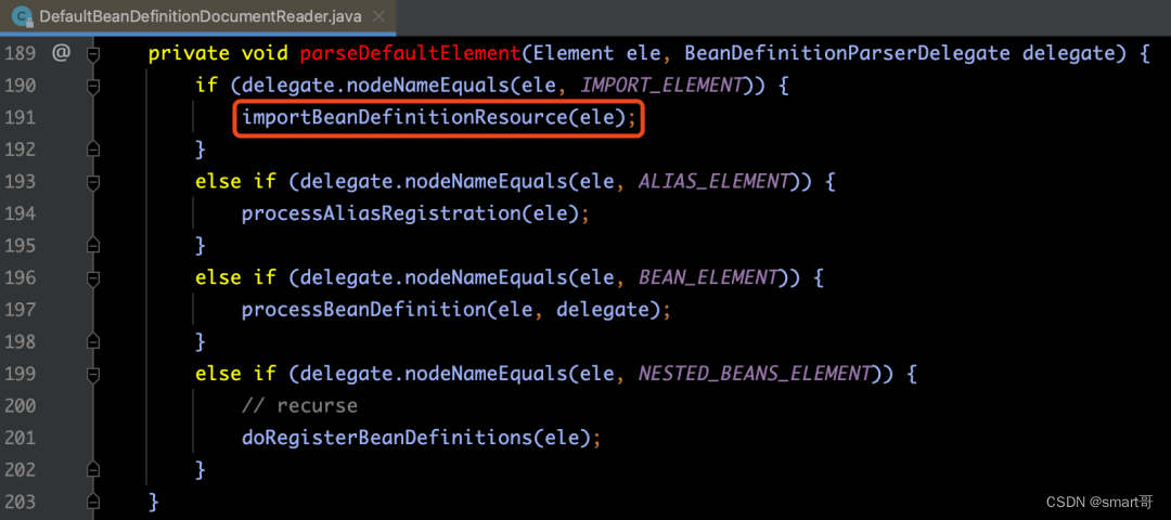 从上图中的源码中,我们可以看出默认标签的解析是在parseDefaultElement(ele, delegate)方法中实现的。我们来看一下这个方法如何实现的: