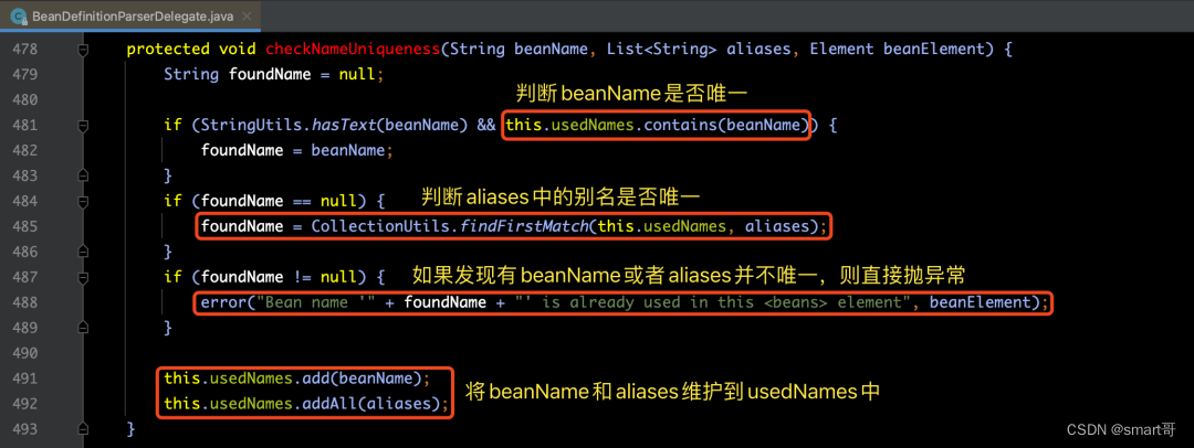 其中,checkNameUniqueness(beanName, aliases, ele)是用于校验beanName和aliases是否是唯一的,即:不允许出现重复的名字(name)。如果发现有重复的,则直接抛出异常。具体逻辑实现,请见下图源码注释: