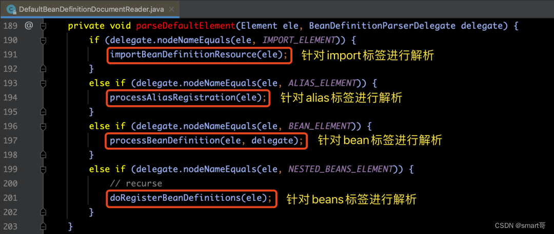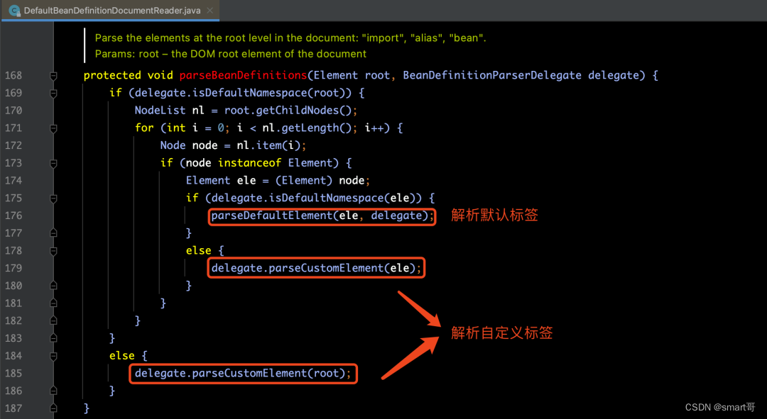还记得我们在上一讲末尾提到的关于默认标签解析和自定义标签解析吧。本讲就来针对默认标签解析进行讲解。为了便于衔接上一讲的内容,我们将源码部分粘贴出来: