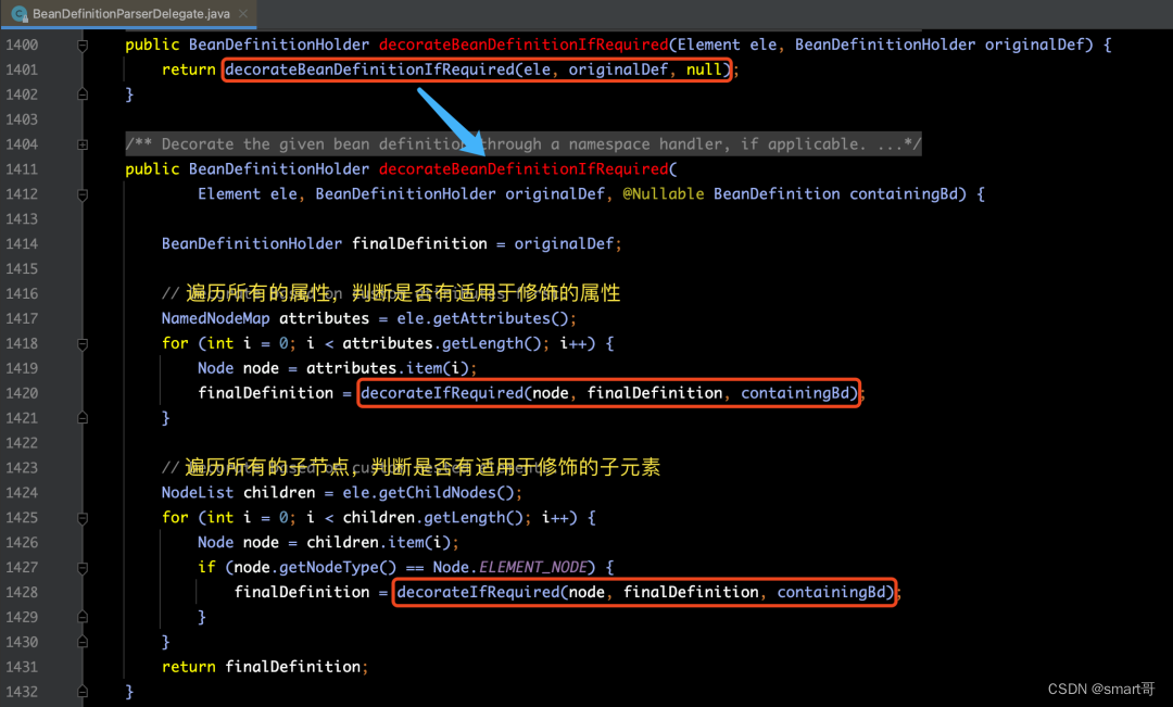 那么,下面我们来看一下decorateBeanDefinitionIfRequired(ele, bdHolder)方法的源码实现: