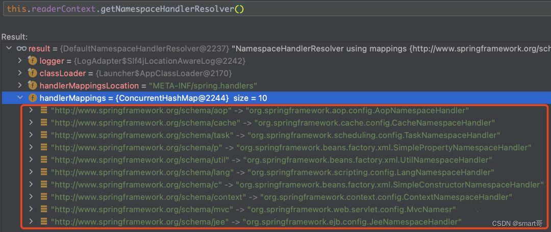 通过调用readerContext.getNamespaceHandlerResolver(),我们可以获得如下红框中的 命名空间对应的处理器(NamespaceHandler)。