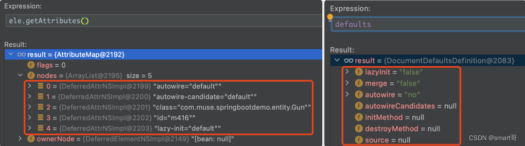 在分析该方法源码之前,我们先来看如下两个遍历中的内容:一个是入参的ele,另一个是全局变量defaults。在下面的源码解析中,我们会经常回过来参照这两个参数所存储的值。