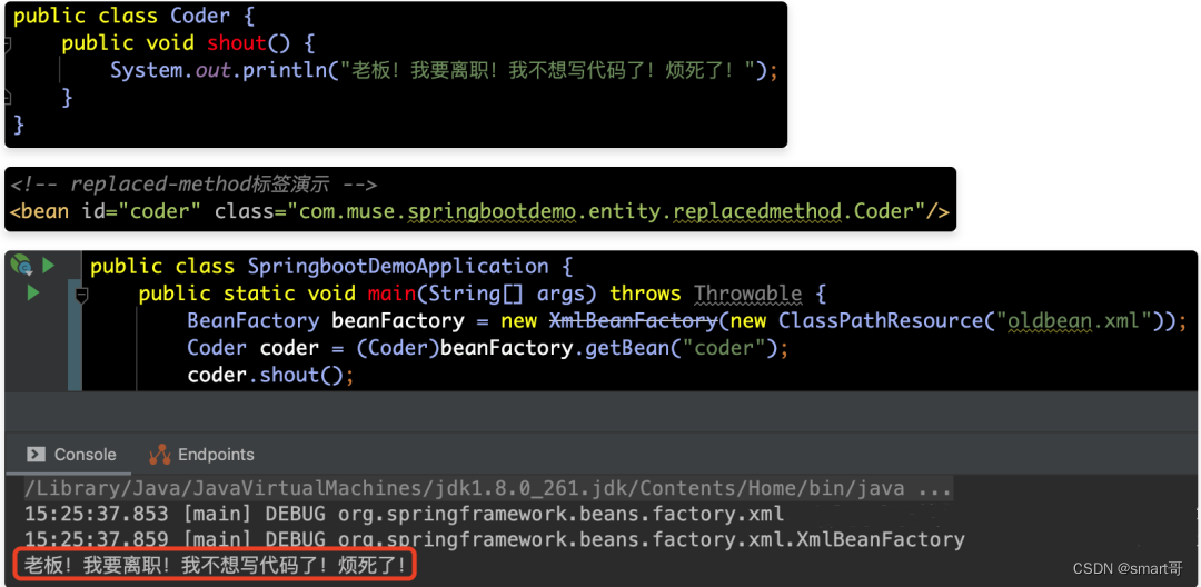 在介绍对replaced-method属性解析之前,我们还是来看一下它的使用场景吧。假设有个程序员Coder觉得工资又少,工作又多,非常烦躁。他打算去跟他们老板吼叫(shout)一番,表达自己内心的不满——“老板!我要离职!我不想写代码了!烦死了!”。具体实现如下所示: