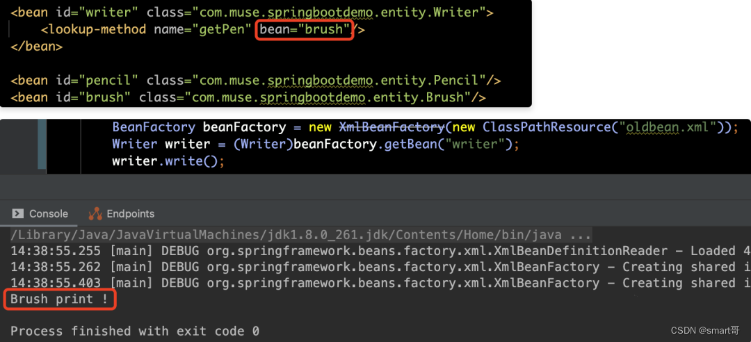 然后,我们可以通过修改xml配置中的lookup-method标签,将原来的“pencil”替换为“brush”,再运行一下,那么运行结果显示“Brush print !”