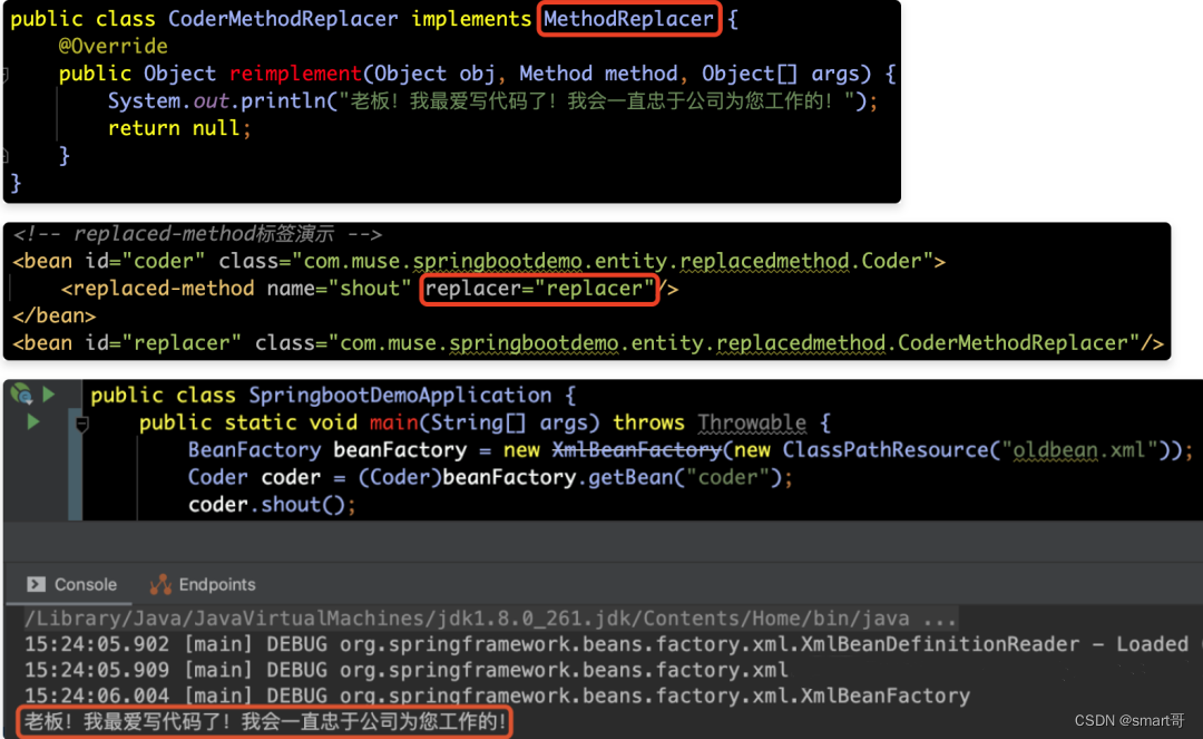 但是在他马上要到达老板办公室门口的时候,接到了他女朋友的电话,电话那头说:“我爸妈同意咱俩结婚了,但是有个前提,就是要买个楼房。”程序员一想,自己买房的钱还没凑够呢!这不能离职啊!但是他此时已经推开了领导办公室的门。为了不喊出离职的那句话,我们可以采用MethodReplacer的方式改变shout方法的实现逻辑,从而让程序员Coder说出:“老板!我最爱写代码了!我会一直忠于公司为您工作的!”这句话,具体实现如下所示: