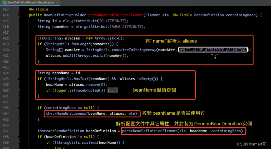 id”和“name”属性,并将name解析为aliases,然后为beanName赋值。