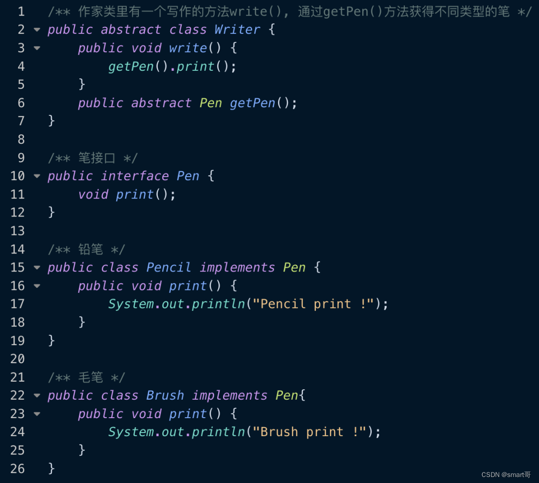 我们平时对于lookup-method的使用其实是不多的,所以,我们在介绍关于lookup-method属性解析之前,先了解一下它是怎么使用的。如下代码所示,我们有一个抽象类Writer,它有一个写作的方法write(),但是具体使用哪种类型的笔去写作,则需要抽象方法getPen()来决定。那么关于笔的类型,我们提供了铅笔(Pencil)和毛笔(Brush)这两种。具体如下所示: