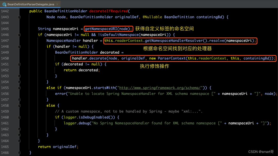当Spring中的<bean>标签的子元素使用了自定义标签配置,则会被decorateBeanDefinitionIfRequired(ele, bdHolder)方法解析,如下所示: